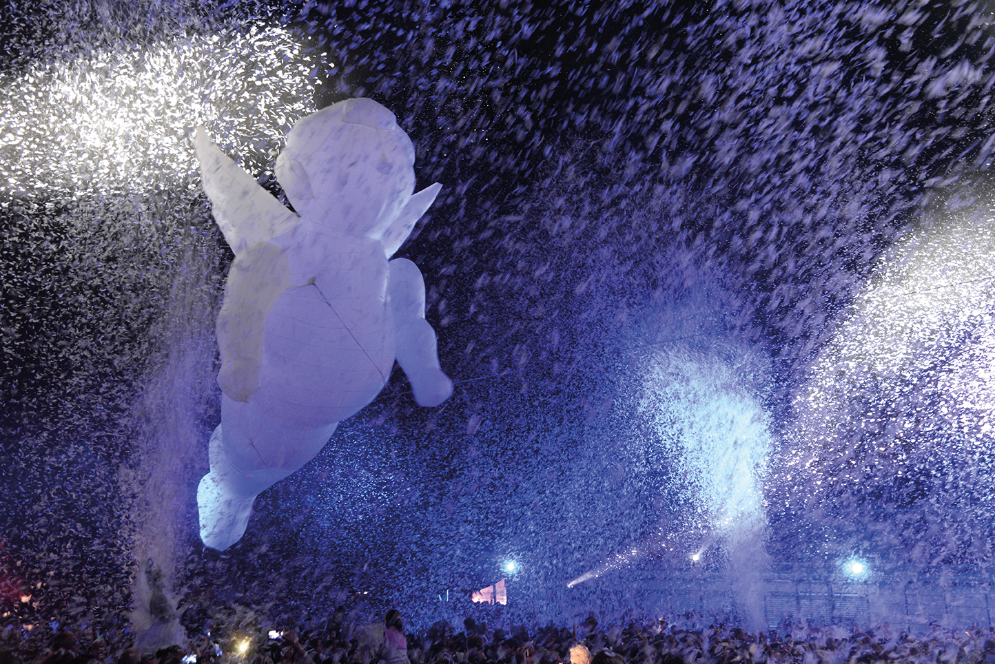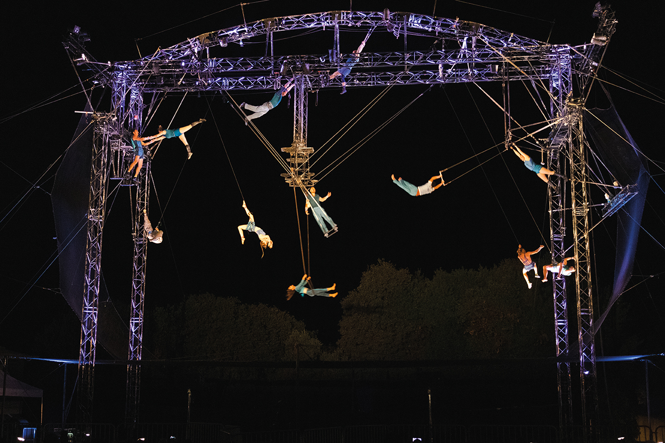 Place des Anges est un spectacle aérien. Une montée progressive de 30 minutes d’évolutions acrobatiques aériennes, empreintes de cirque au-delà des numéros traditionnels et soutenue par les chants d’enfants du monde.