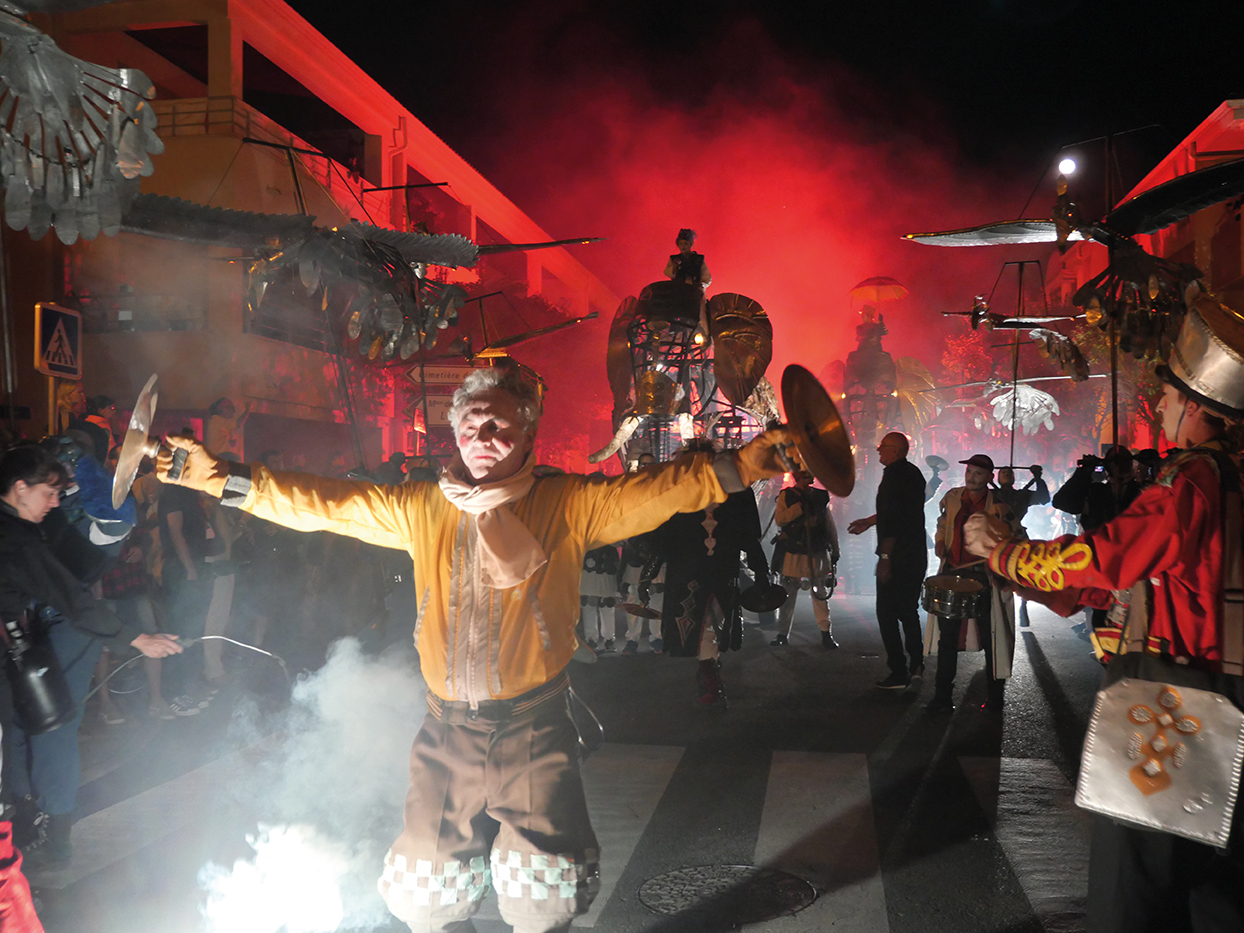 Sortis tout droit de la boîte à jouets du fils de Gargantua, trois éléphants mécaniques avec une escadrille de Phénix métalliques traversent la ville, au son des cornemuses, bombardes et tambours d’une petite armée de soldats de plomb.